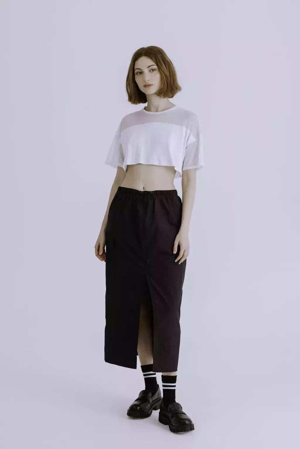 FALDA CARGO CON AJUSTE EN LA CINTURA, BOLSILLOS CARGO Y TAJO EN EL DELANTERO, TELA SIRE CRUSH