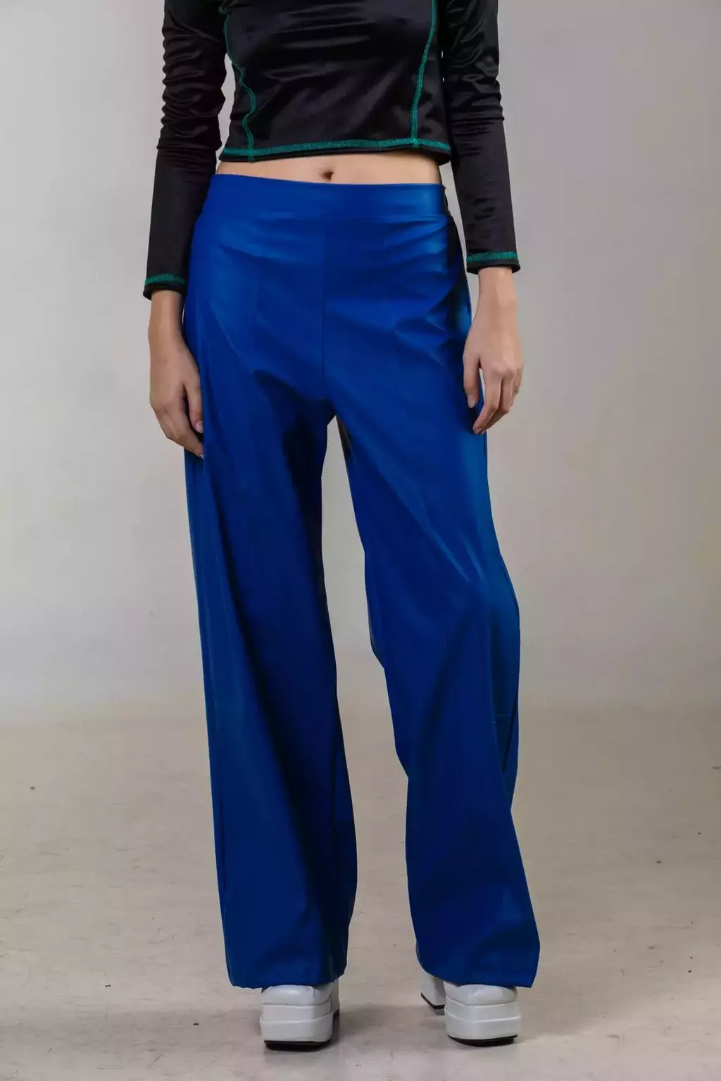 PANTALON ANCHO ELASTICO EN CINTURA TRASERA LISO CON RECORTE VERTICAL EN CUERO SINTETICO, LA MODELO ESTA UTILIZANDO EL TALLE S