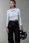 REMERA MANGA LARGA, ESCOTE REDONDO, ESTAMPA EN DELANTERO Y ESPALDA DE JERSEY ALGODÓN, LA MODELO ESTA UTILIZANDO TALLE S