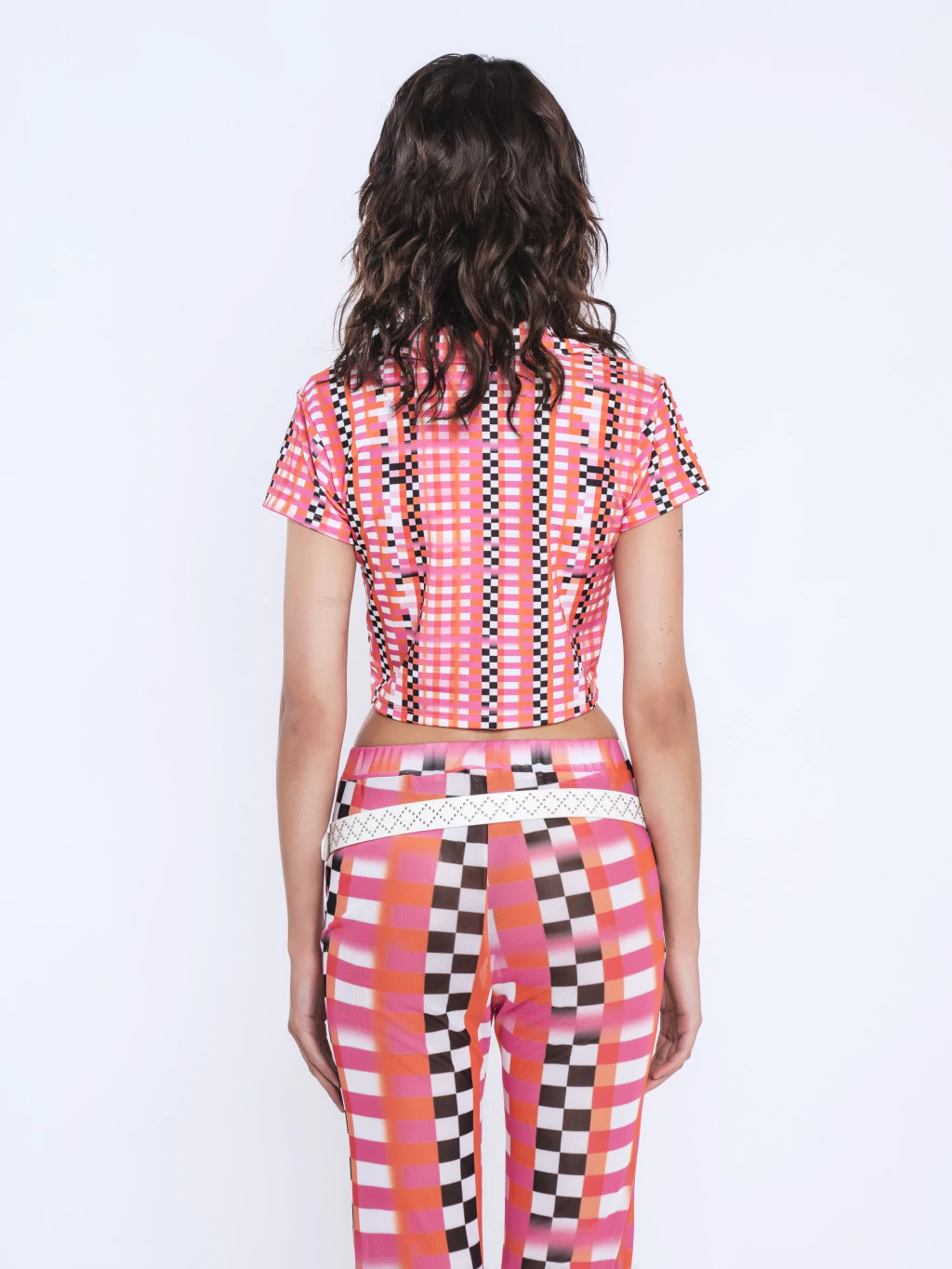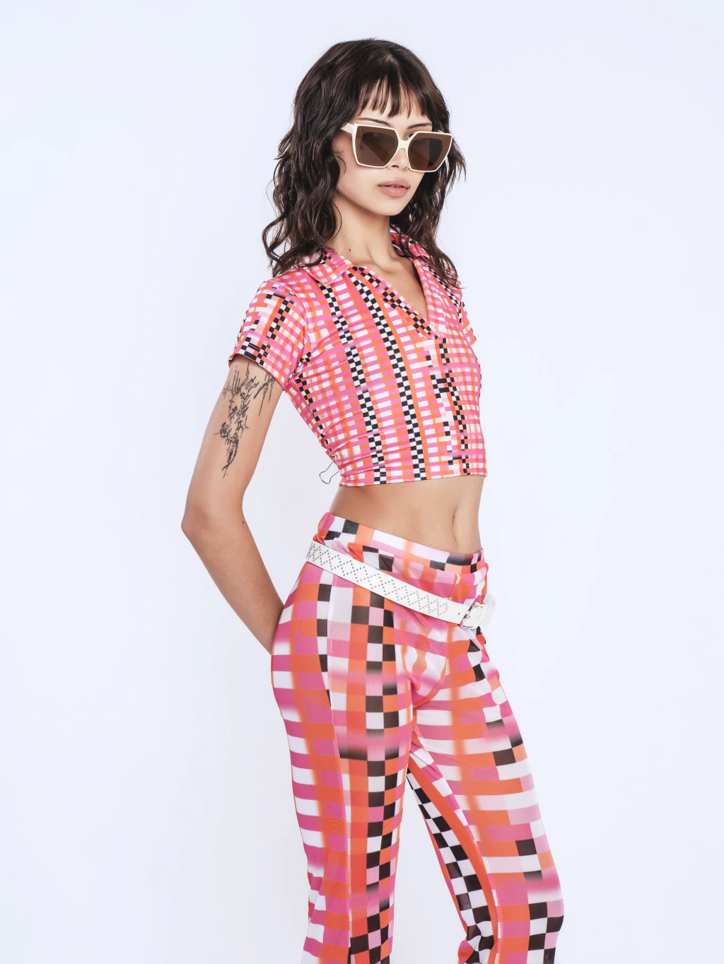 Una prenda que combina frescura y estilo en cada detalle. Confeccionada en microfibra de alta calidad, su estampa full vichy aporta un toque clásico y moderno a la vez. El diseño crop con cuellito y mangas cortas realza tu figura, ideal para un look casual y sofisticado.