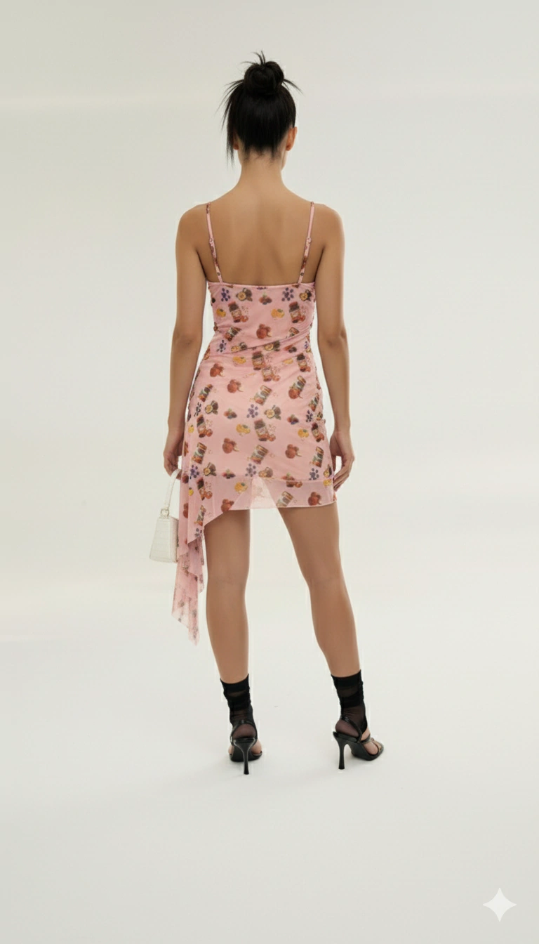 Una prenda única que combina frescura y estilo. Confeccionado en microtul con una vibrante estampa full frutas, su diseño irregular con breteles aporta un toque moderno y femenino. Ideal para lucir en días soleados o eventos casuales, este vestido es la elección perfecta para destacar y sentirte cómoda.