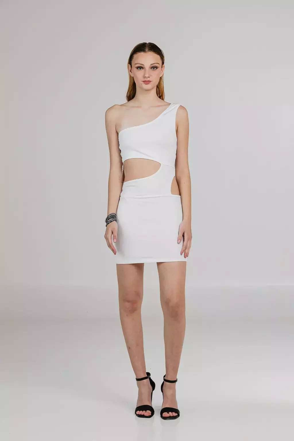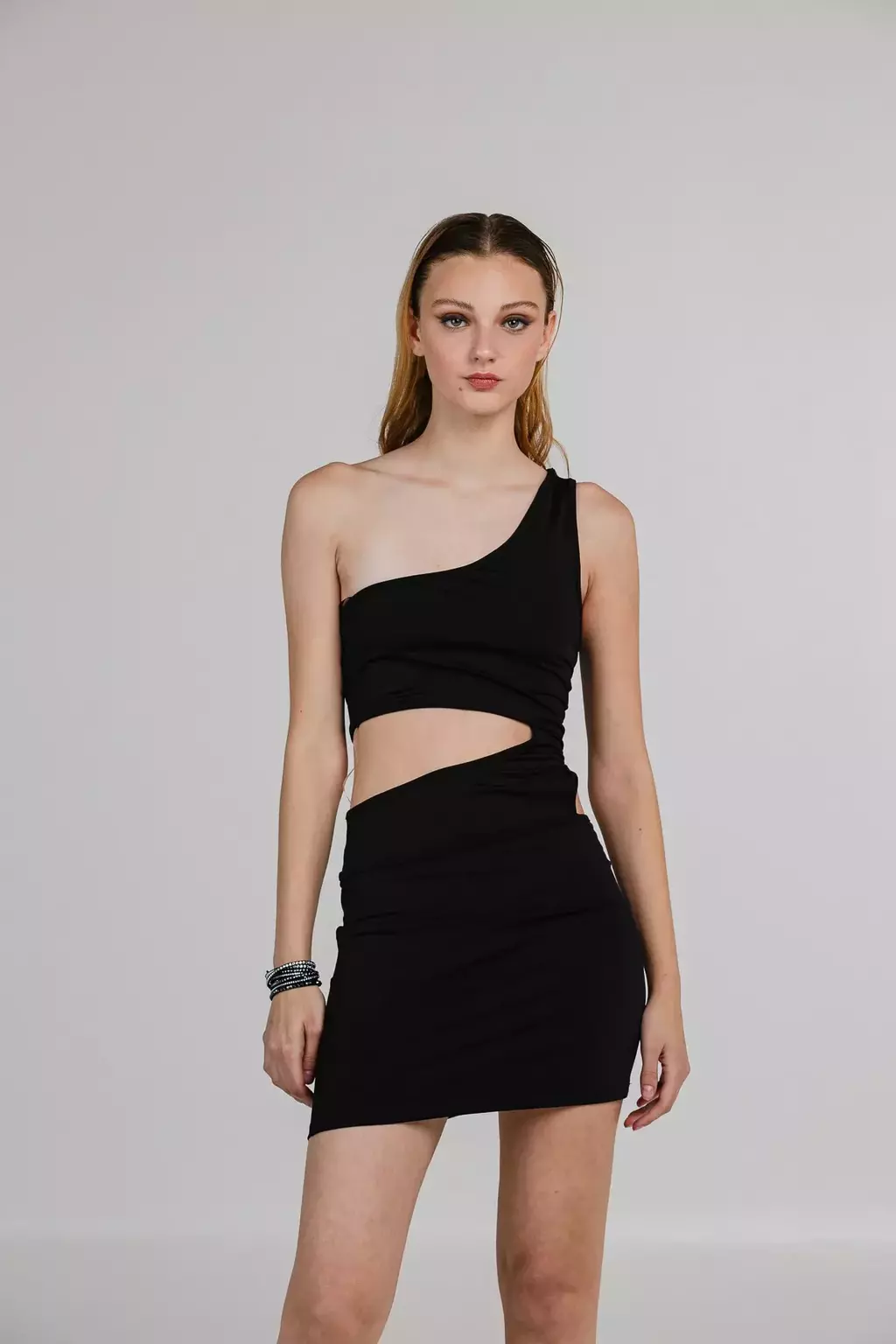 VESTIDO CON SUSTRACCIONES EN LA CINTURA, HOMBROS ASIMETRICOS, TELA MICROFIBRA ELASTIZADO